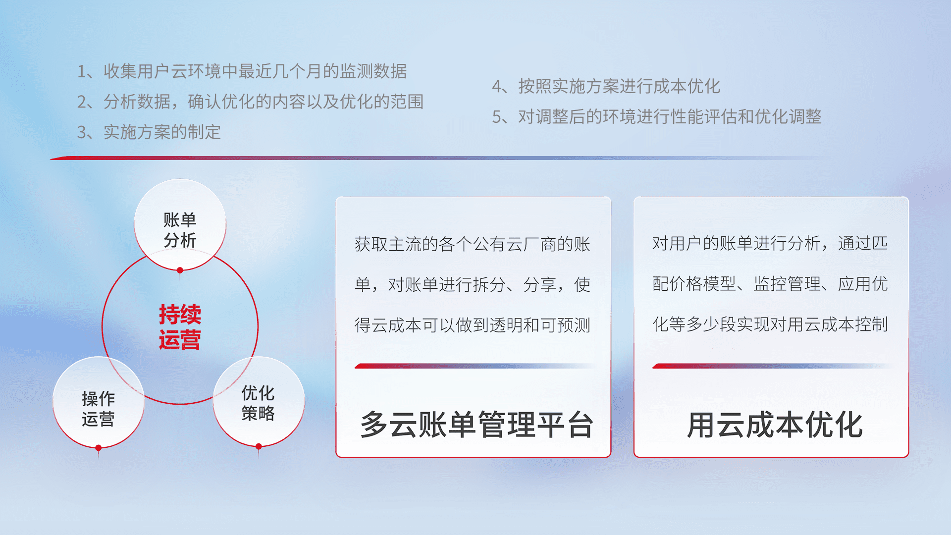 通过多云纳管,,,,以统一的资源数据模型把客户的云资源进行抽象和封装,,,进而实现对多云资源的统一操作,,,保障云资源管理的可靠性、、、、稳定性与可用性。。量身定制化运维内容,,,,配置、、、开发运维、、、、补丁管理、、、备份、、、监控、、认证和访问管理、、、、审计和日常巡检等,,,,保障在用云过程中的可靠度,,,,稳定度以及高可用率。。。。